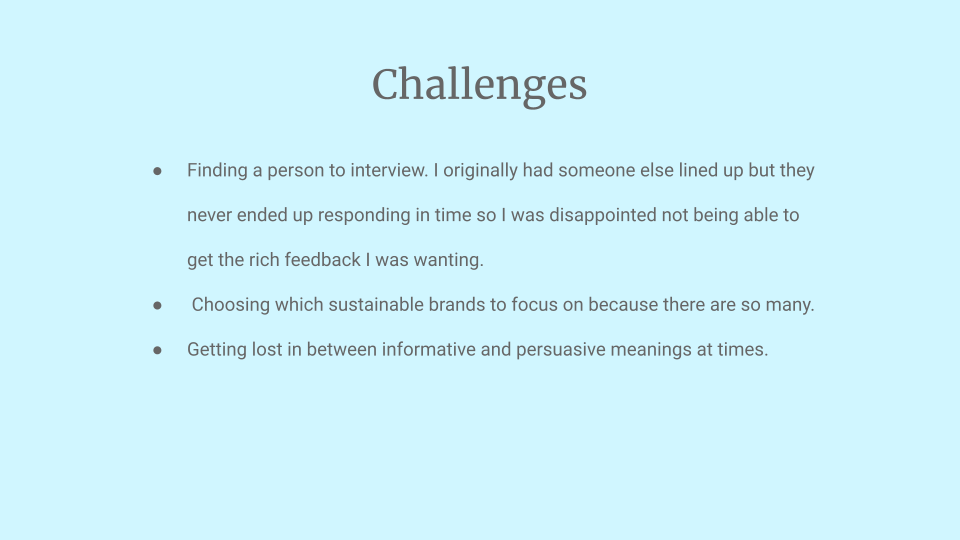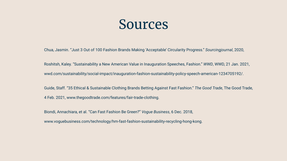 Research presentation created to gain and spread knowledge about sustainability within the fashion industry and the importance of being eco-conscious.